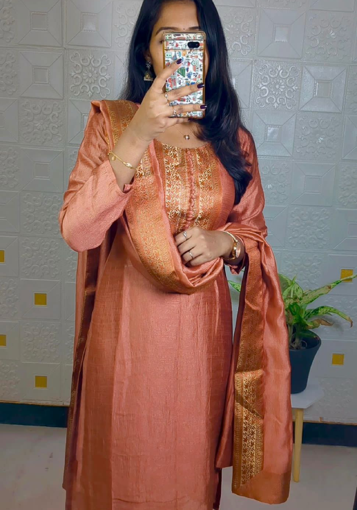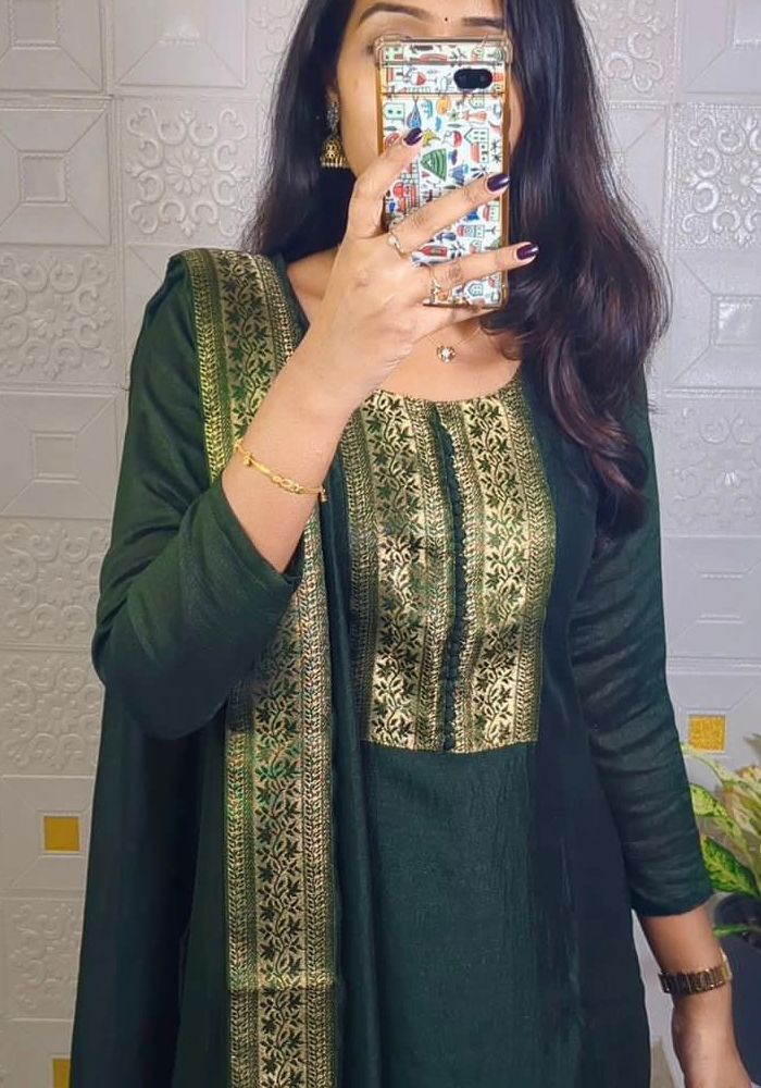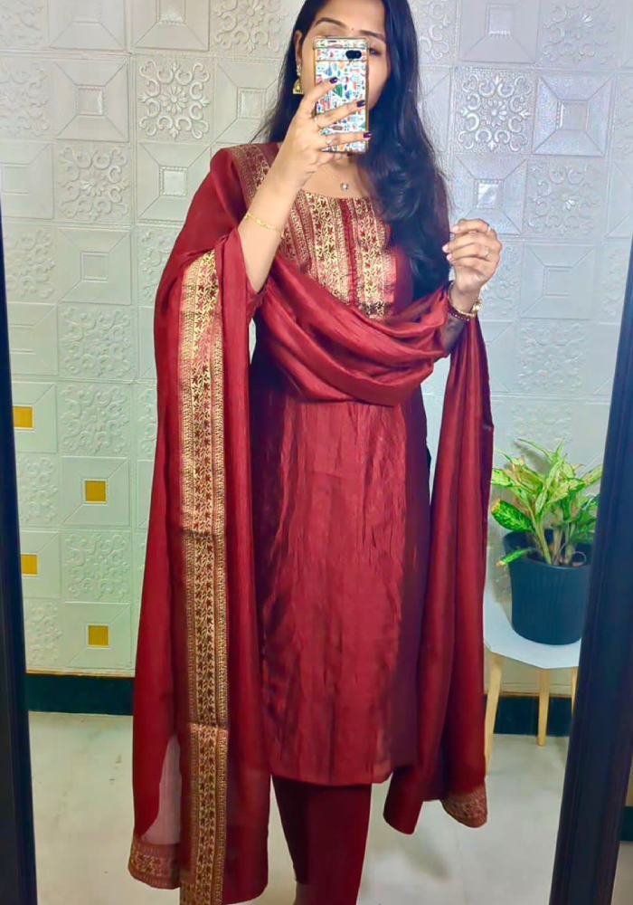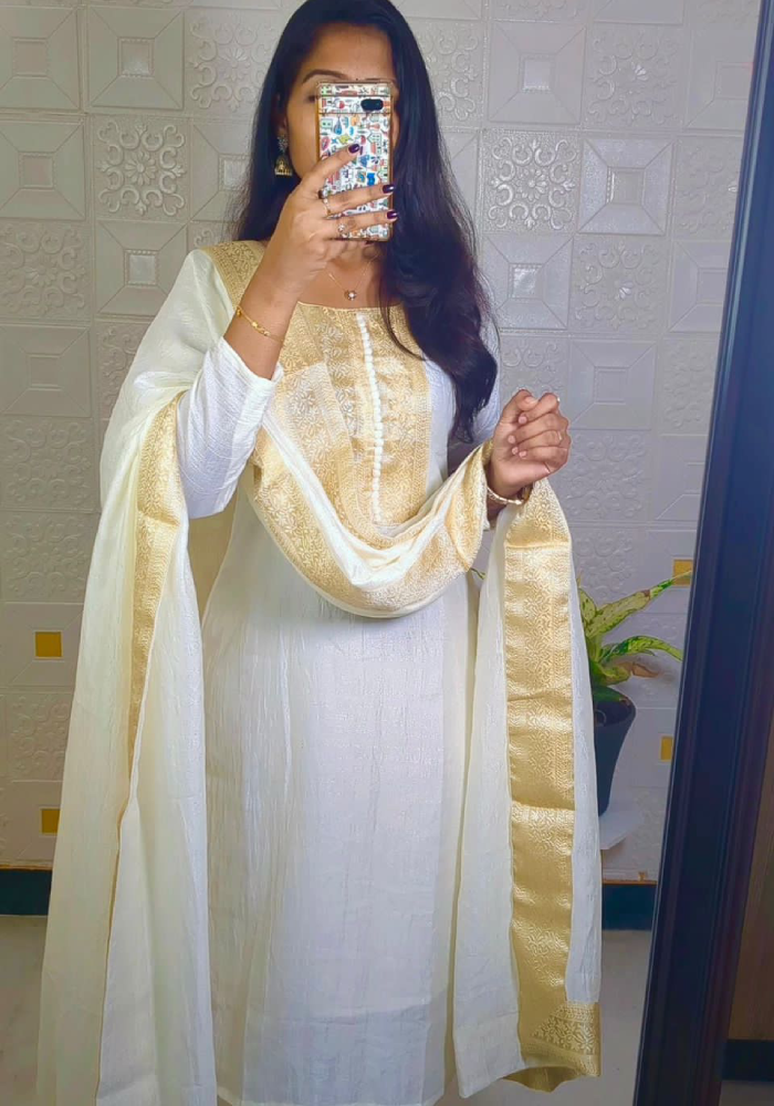 Women’s Embroidered& Pitten Work Printed Cotton Kurta & Pant With Malmal Dupatta Set