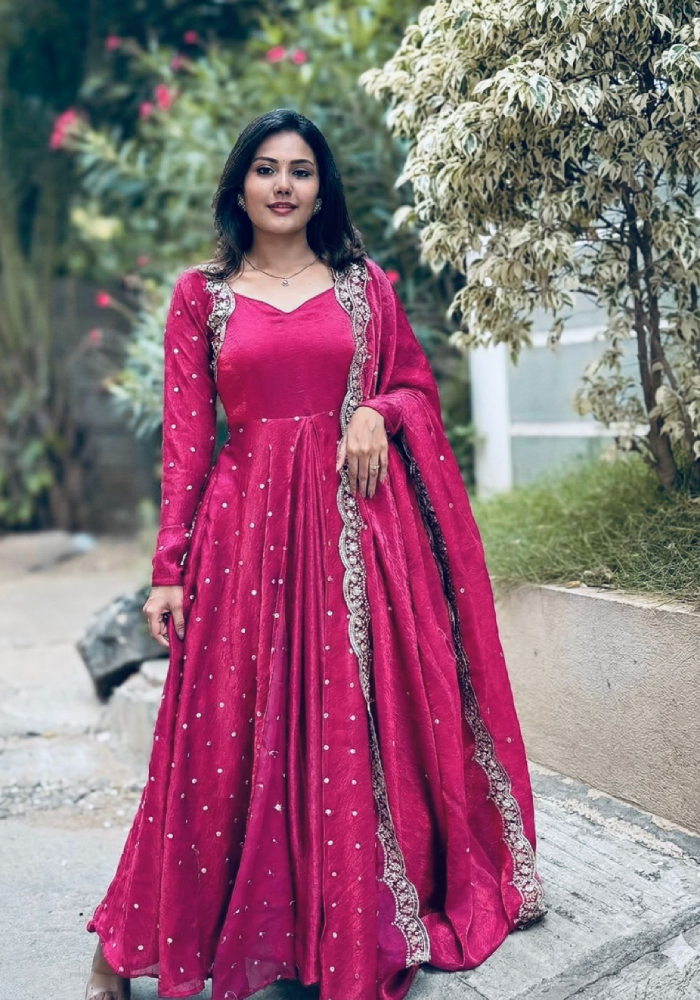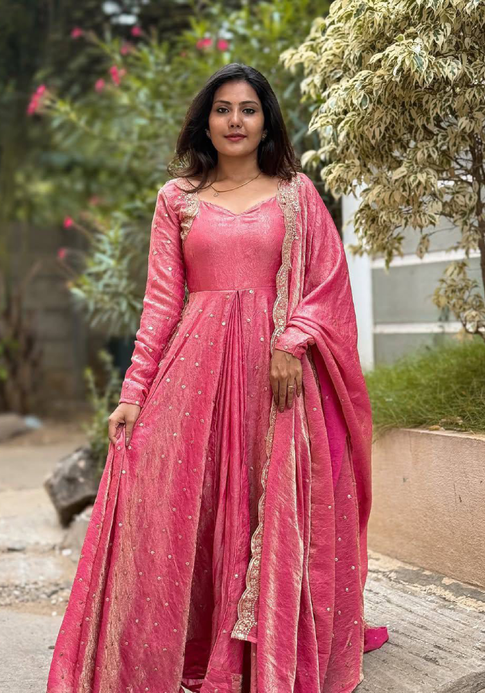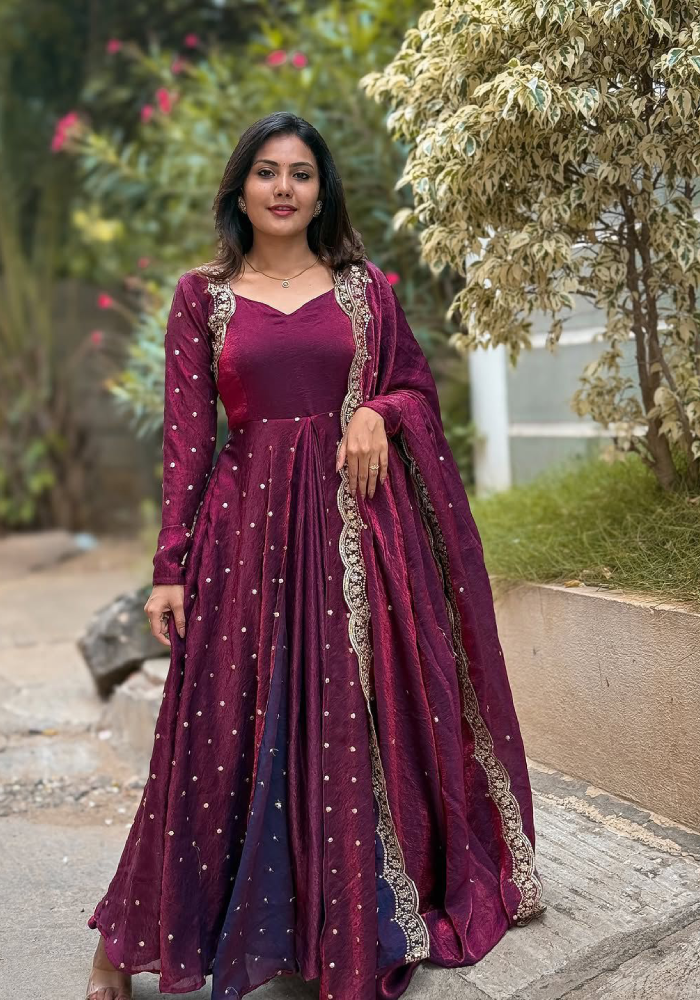 Step Into The World Of Style With Our Mesmerizing Anarkali! The Intricate Work Details All Over The Yok And Sleeves Represents Elegance Fabric Creates A Captivating Look That’s Both Elegant And Trendy. Embrace The Beauty Makes A Statement Wherever You Go.