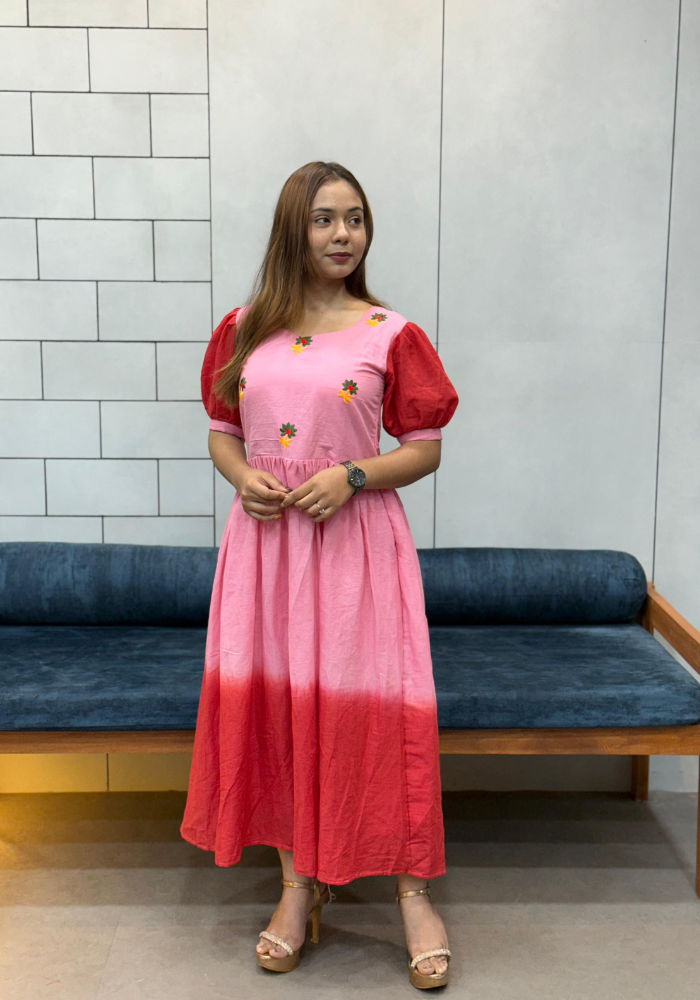 Rich Cotton Silk Gown With A Pleated Flare, Adorned By Golden Jacquard Work And Vibrant Contrast Piping Details.