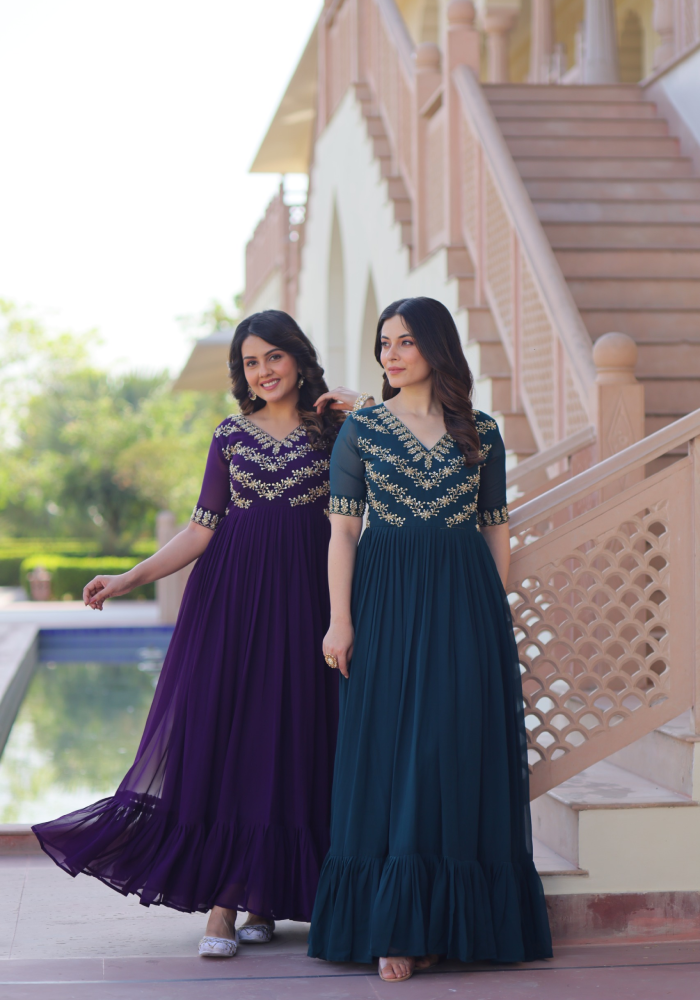 Step Into The World Of Style With Our Mesmerizing Anarkali! The Intricate Work Details All Over The Yok And Sleeves Represents Elegance Fabric Creates A Captivating Look That’s Both Elegant And Trendy. Embrace The Beauty Makes A Statement Wherever You Go.