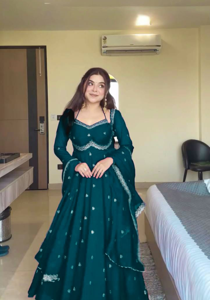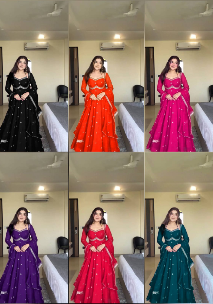 Desirable Women’s Fully Flair Gown Made With Star Georgette Fabrics And Designer Embroidered Dupatta With Attractive Lace Border,,,length :- 56 Inch