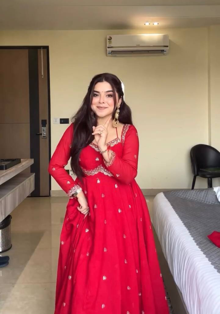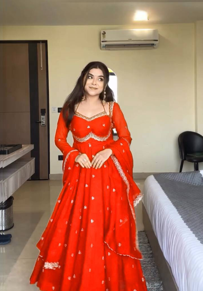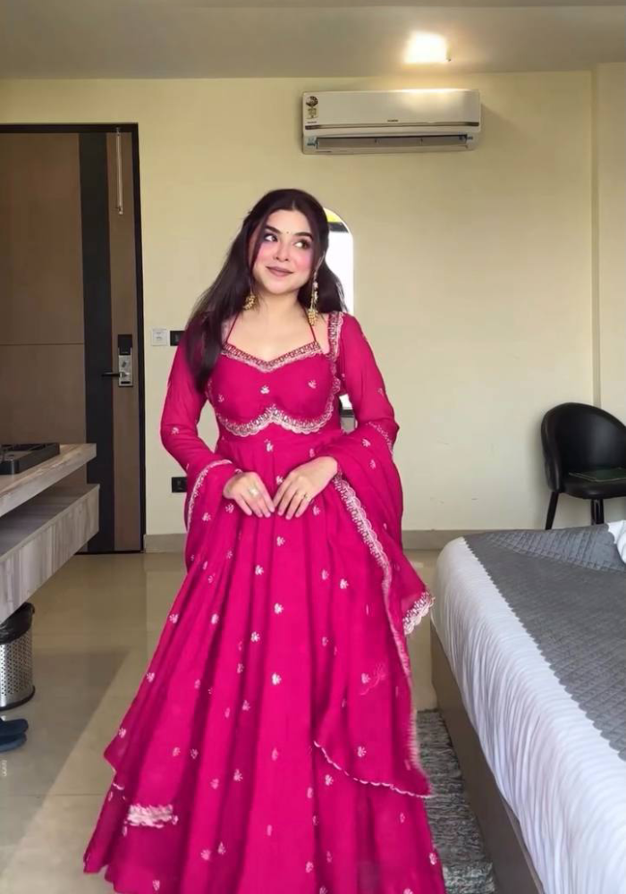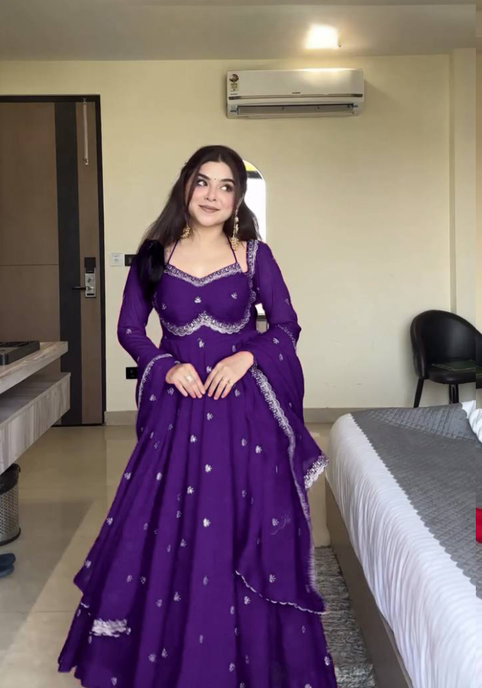 Step Into The World Of Style With Our Mesmerizing Anarkali! The Intricate Work Details All Over The Yok And Sleeves Represents Elegance Fabric Creates A Captivating Look That’s Both Elegant And Trendy. Embrace The Beauty Makes A Statement Wherever You Go.