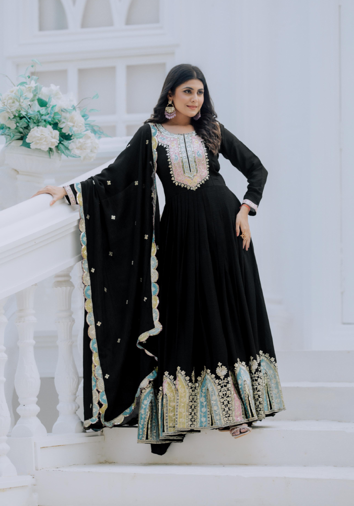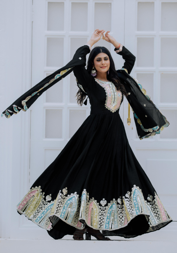 Faux Blooming gown with Sequins-Multi And Beads Embroidered Work, It looks graceful for women, it Designed to flatter all body types, gowns for women combine the best parts of western and Indian wear into one stunning ensemble.