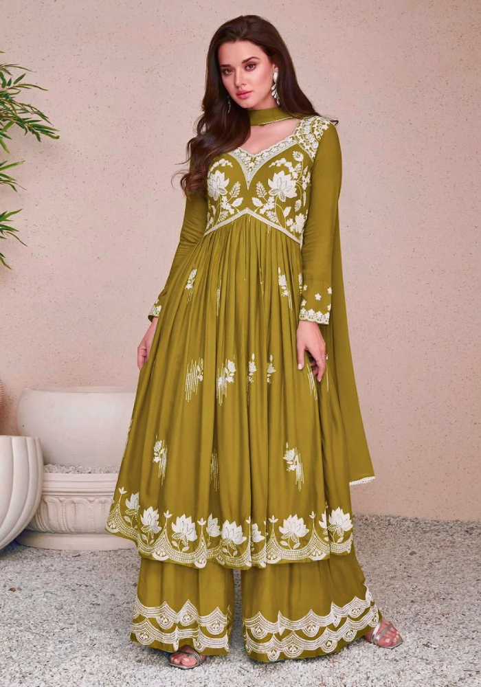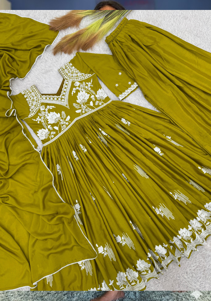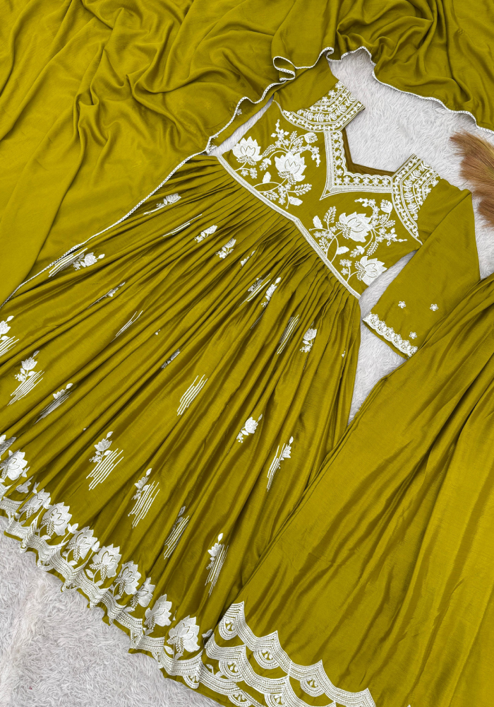Unveiling Our Stunning Long Maxi In Vichitra Silk Fabric, Paired With An Intricately Embroidered Yok. Perfect For Festive Celebrations Or Pre-wedding Events Like Haldi, This Outfit Radiates Timeless Elegance!