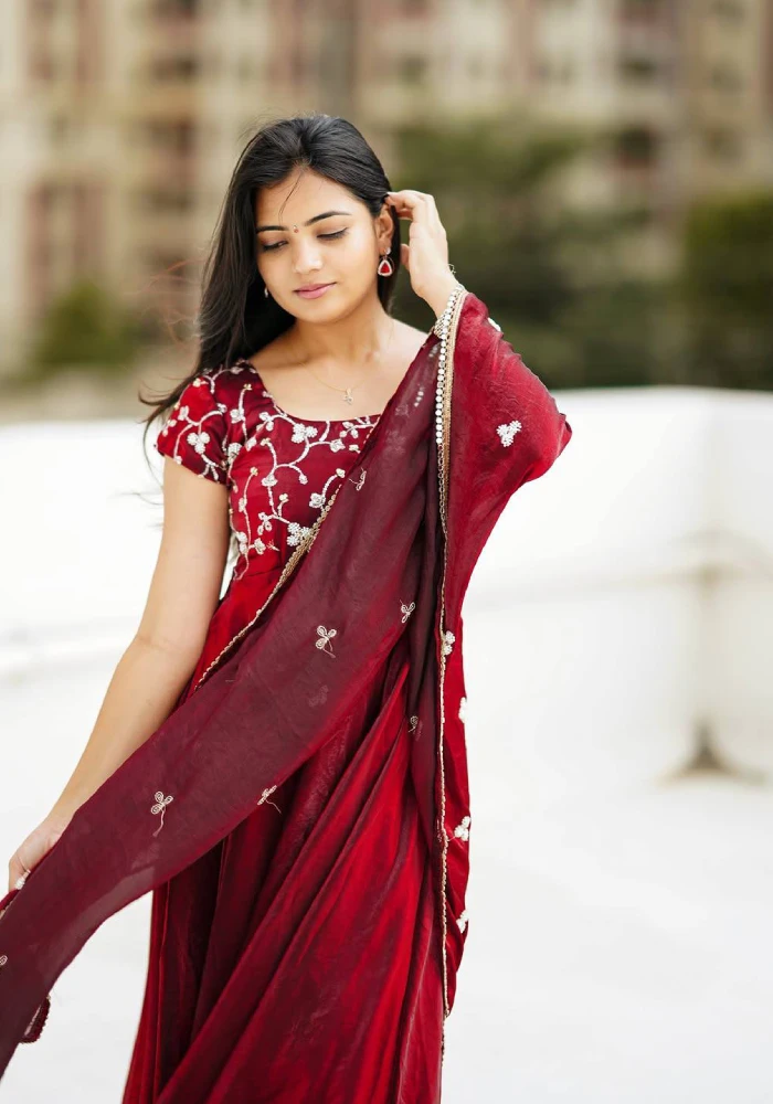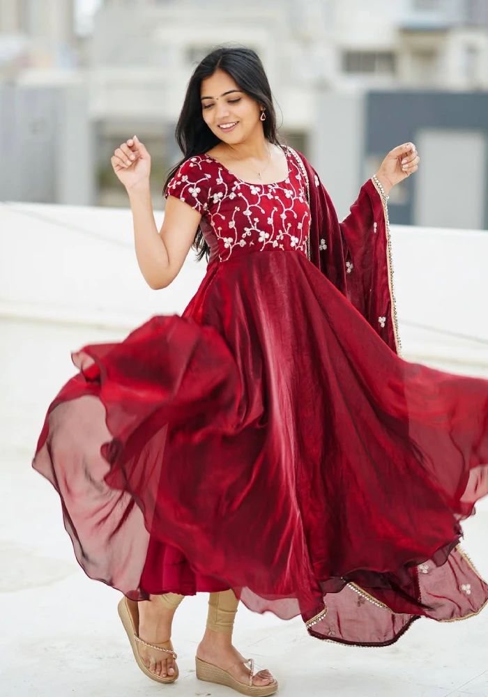 ELEGANCE MEETS TRADITION IN THIS BEAUTIFUL SPARKLING GEORGETTE ANARKALI! CRAFTED FROM LUXURIOUS FABRIC WITH BEAUTIFUL YOK EMBROIDERY IT OFFERS COMFORT AND STYLE, WHILE THE SLEEVE ADDS EXTRA BLING AND CHARM.