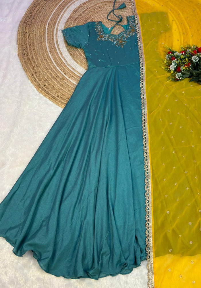 Faux Blooming gown with Sequins-Multi And Beads Embroidered Work, It looks graceful for women, it Designed to flatter all body types, gowns for women combine the best parts of western and Indian wear into one stunning ensemble.