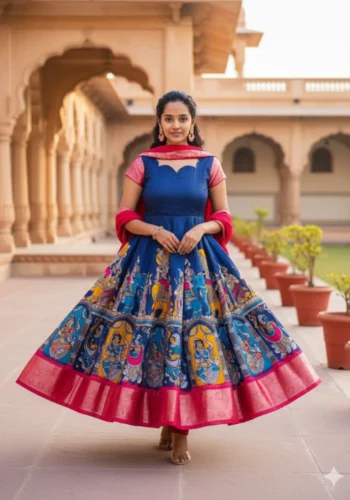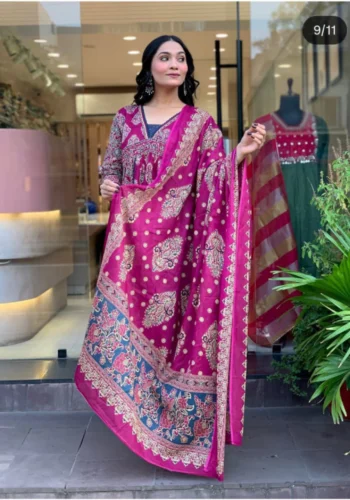 Step into timeless elegance with this exquisite designed to make you stand out at any festive or celebratory occasion. Crafted from luxurious silk, the aline kurti set with dupatta features a graceful flare that flows beautifully, creating a regal and sophisticated look silhouette. The intricate detailing on the yoke adds a touch of traditional charm, while the soft cotton 60 60 fabric ensures all-day comfort.