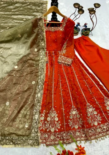 Introducing Our Striking Vichitra Anarkali Adorned With Exquisite Embroidery. Paired With A Delicate Border Dupatta, This Ensemble Exudes Elegance And Sophistication, Perfect For Any Special Occasion.