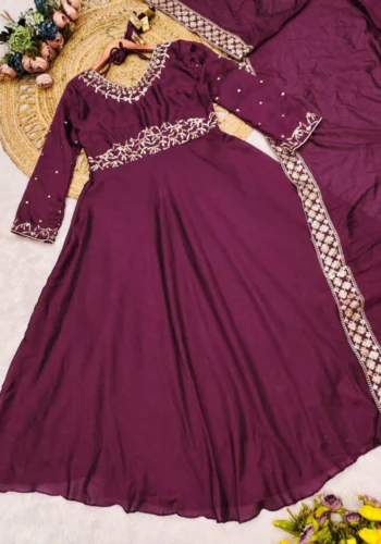 Stay Effortlessly Beautiful In Our Emb Anarkali A Perfectly Enhanced With Wine & Golden Thread Work All Over The Yok The Outfit Comes Paired With A Dupatta That Has A Sparkling Borders ♥️✨